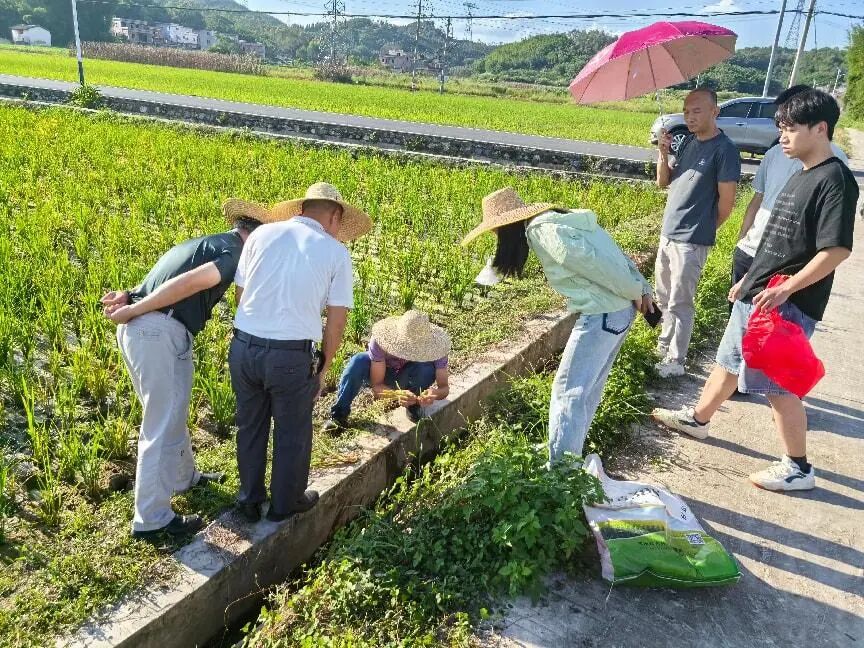 培训结束后,得知镇内部分村屯水稻田出现叶片发黄、长势衰弱等病害问题,科技特派员团队当即在莲都镇干部、驻村工作队队员的陪同下,赶赴文华村等发病水稻田现场。在田间,专家们俯下身子仔细查看水稻叶片、根系生长情况,向农户询问近期水肥管理、用药情况,通过“看症状、查环境、问管理”的方式,快速判断出病害成因主要为水稻纹枯病与钻心虫混合发生,并现场制定了针对性解决方案。
