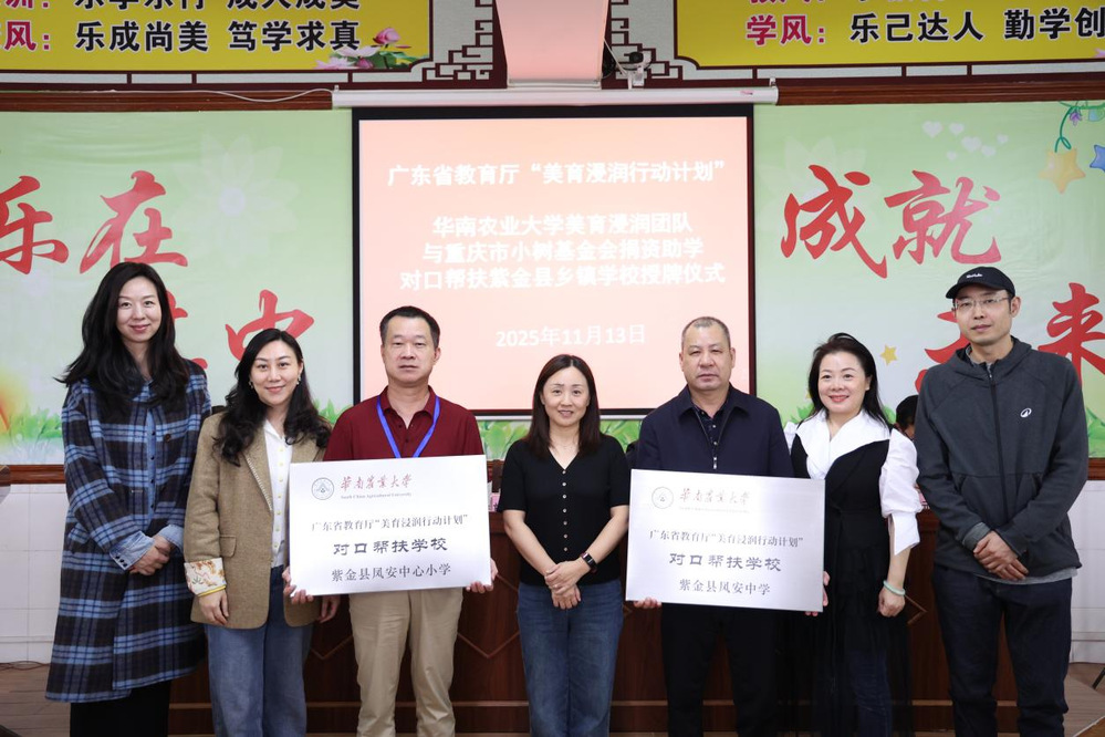 活动举行了“美育浸润行动计划”对口帮扶学校授牌仪式。华南农业大学联合重庆市小树公益基金会向紫金县多所乡村小学捐赠价值逾13万元的助学物资,并赠予“小树图书馆”牌匾,为当地美育资源注入新动力。座谈会上,与会双方围绕师资培训、课程建设等议题深入交流,并就规划美育夏令营、送教下乡以及艺术专长培优等工作达成共识。