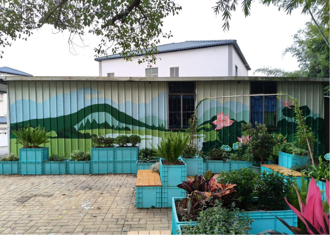 随后,团队在凤安镇完成两处墙绘。其中,仁里村沁香园墙绘围绕村落文化特色展开,以青山绿水为背景、以荷花为视觉核心,营造与周边环境相协调的乡村美育氛围;凤安镇中心幼儿园墙绘以“凤凰栖安处,客韵育新芽”为主题,结合幼儿教育特点,融入青山绿水、梧桐、凤凰、客家民居等意象,打造客家文化浸润下的校园艺术场景。