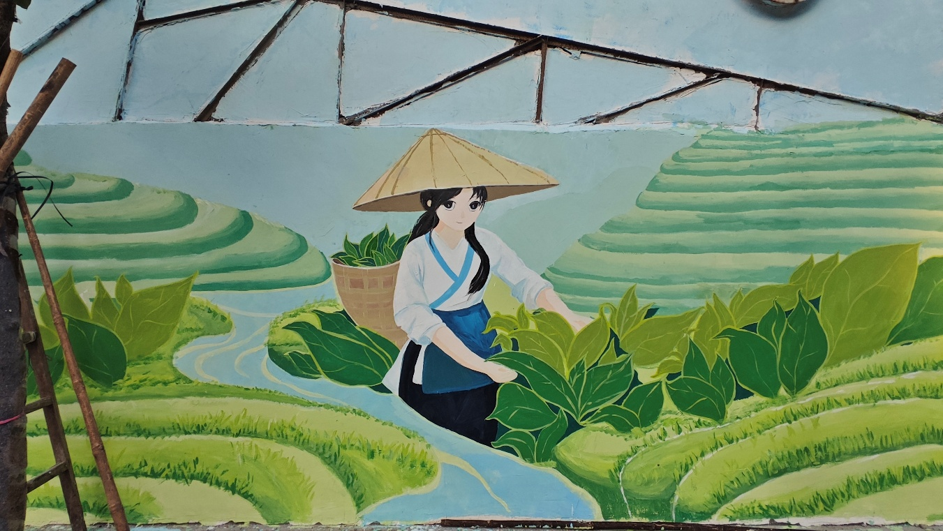 在紫城镇新紫路,团队完成以“蝉茶飘香,魅力紫金”为主题的墙绘,融入紫金蝉茶、柚子、客家围屋等元素,展现紫金生态优势与人文底蕴,形成贴近城乡生活场景的公共艺术表达。