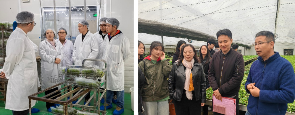 在组培工厂,团队成员实地排查问题,董朝霞副教授结合学院组培技术研究成果,针对苗种污染、玻璃化等痛点,提出“优化消毒配比+升级无菌规范”等落地方案,并对生根率提升、炼苗移栽等关键环节提供指导。